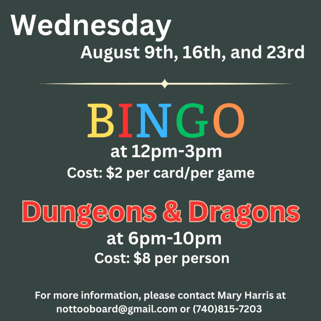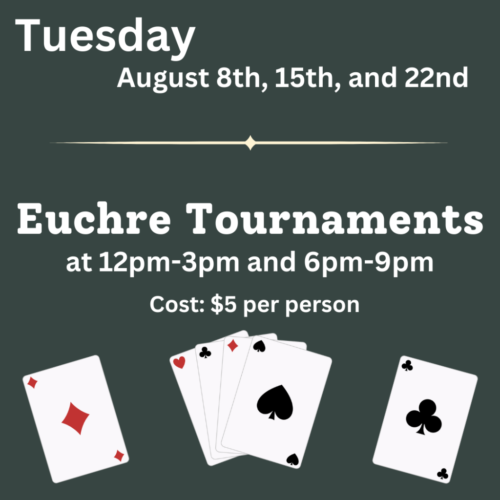 On Tuesday August 8th, 15th, and 22nd, we will be hosting euchre tournaments at 12-3pm and 6-9pm. Then on Wednesday August 9th, 16th, and 23rd, we will be hosting games of Bingo at 12-3pm and Dungeons and Dragons at 6-10pm.