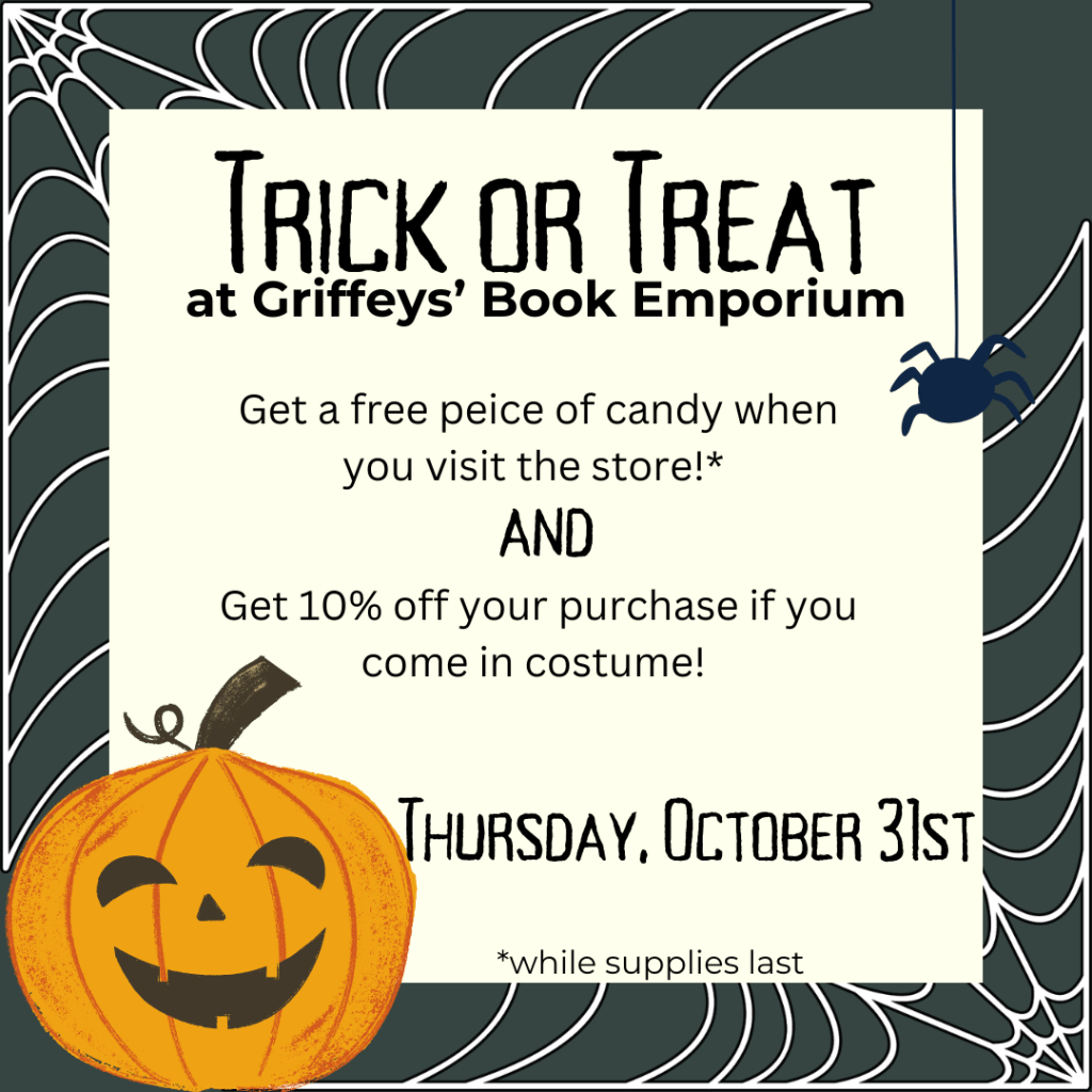 –The Spooky Market. October 19th, 11am-3pm. Shop a selection of local vendors, makers, and artisans inside Griffeys’ Book Emporium! Stay spooky with special, locally made gifts and goodies you won’t find anywhere else.