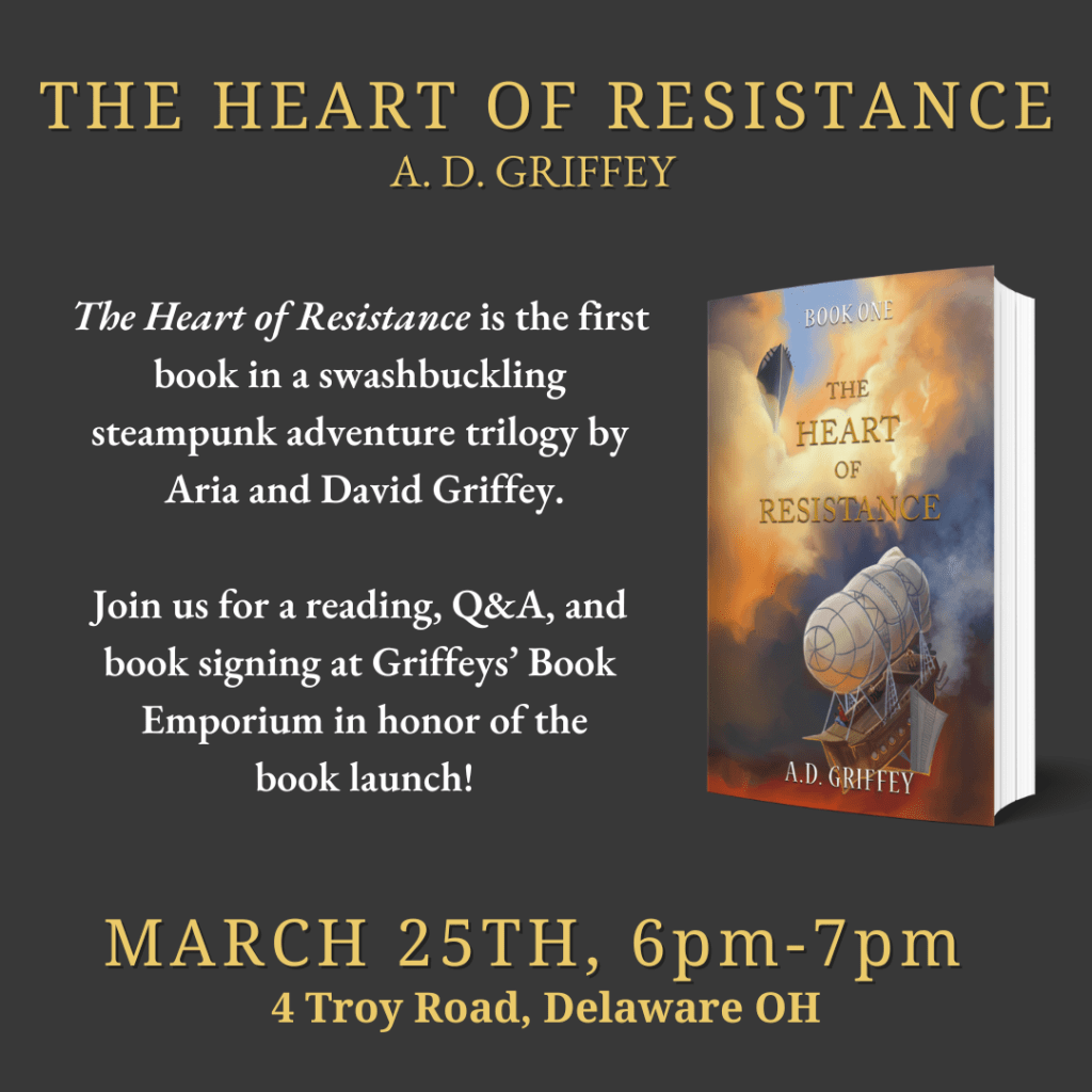 –The Heart of Resistance Launch Party. March 25th, 6pm-7pm. Please join us in celebrating the launch of Aria and David’s steampunk adventure novel The Heart of Resistance. We will be reading selections from the novel, answering your questions, and signing books! Copies will be available to purchase at or after the event. We have been working on this book for over three years and we can’t wait to share it with you!